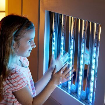 An interactive wall panel featuring five clear tubes filled with a continuous row of LED lights, backed by a mirror for greater visual impact. The sound sensitive light tubes illuminate from top to bottom in response to any noise, change colour and then fade slowly from bottom to top when the noise stops. Change the settings on the control panel to select multi-coloured or single colour display, or to alter the sound sensitivity of the inbuilt microphone. Also compatible for use with the SpaceMaster Controller, the Bright Sparks Sound Reactive Panel is ideal for cause and effect learning and vocal sound work.